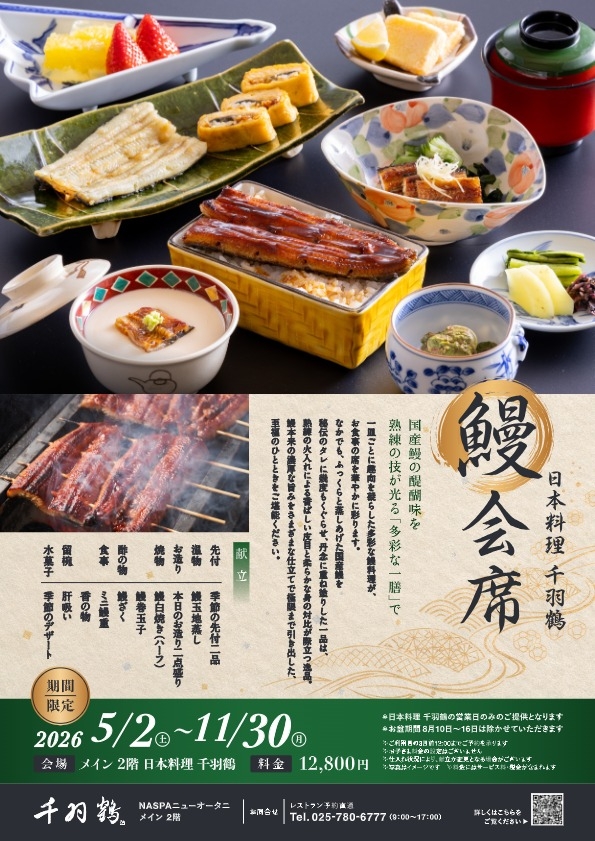 | 期 間 | 2026年5月2日(土)~11月30日(月) ※日本料理 千羽鶴営業日のみのご用意となります ※お盆期間8月10日~16日は除かせていただきます ※ご利用日の3日前12:00までご予約を承ります |