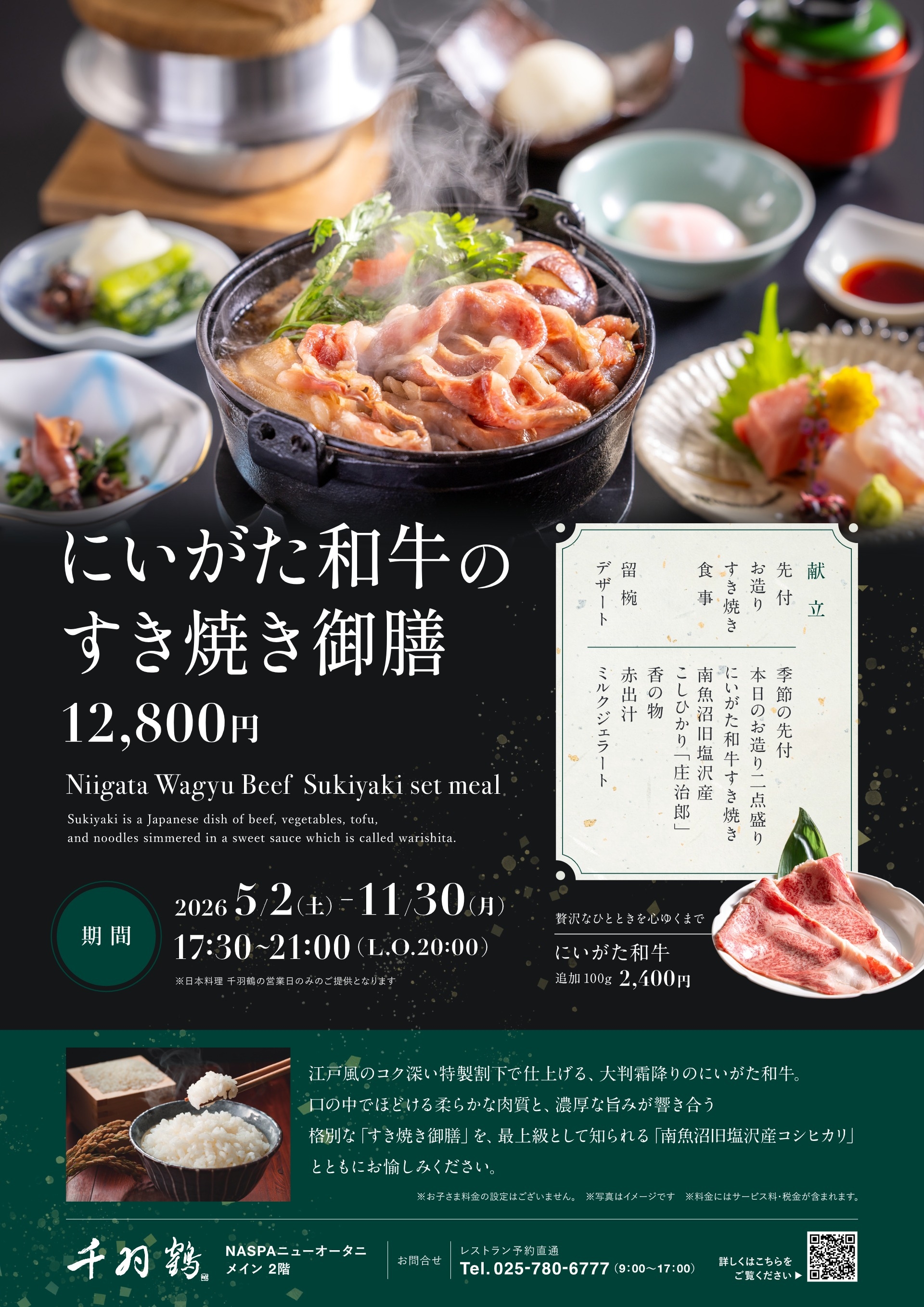 | 営業時間 | 17:30~21:00 ※にいがた和牛すき焼き御膳は20:00ラストオーダーとさせていただきます |