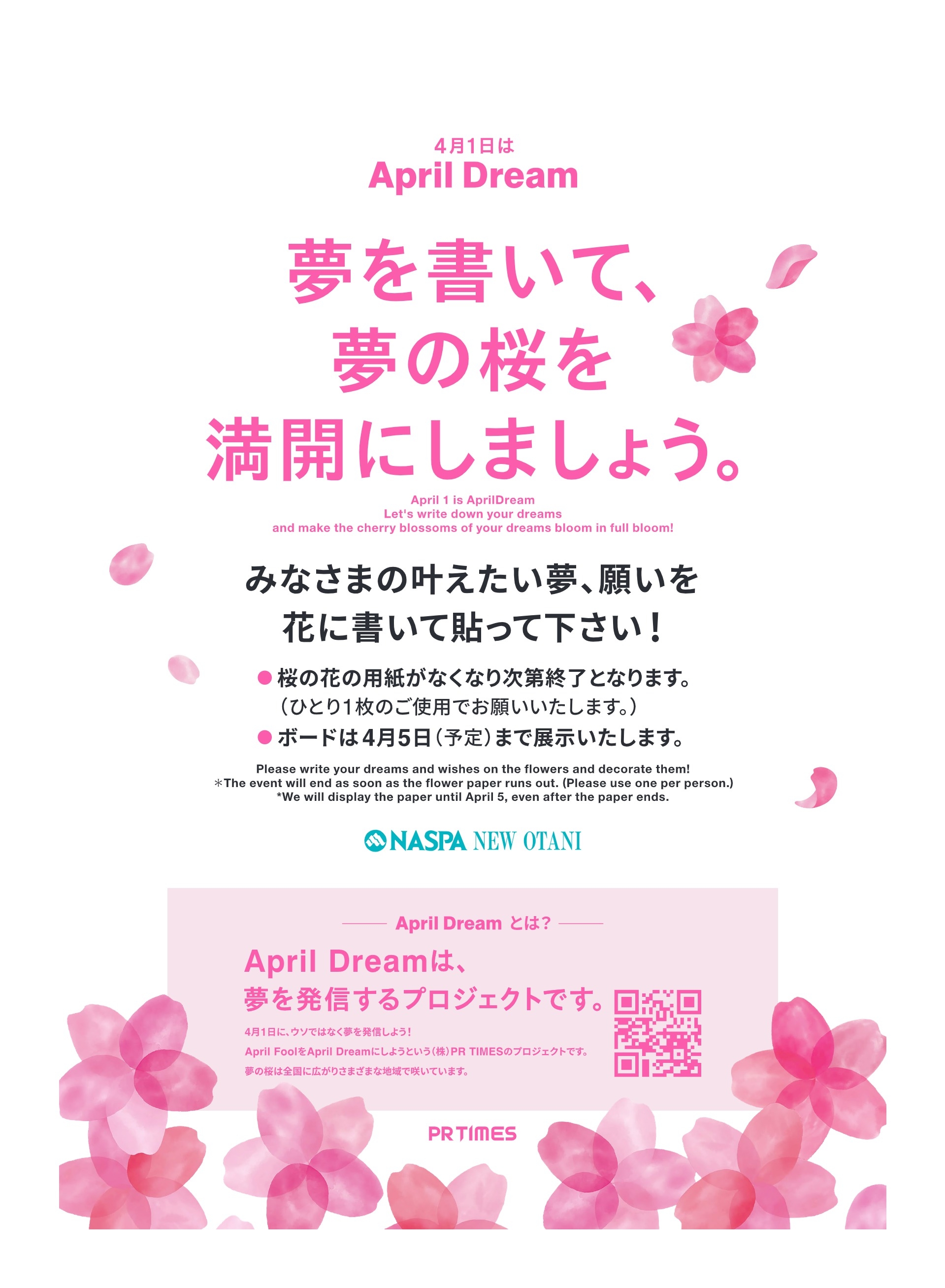 PR TIMESさま主催の「April Dream」の活動に賛同し、NASPAニューオータニは4年連続で「Dreamパートナー」として参加しています。