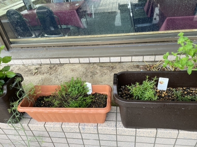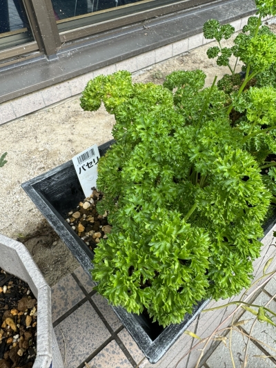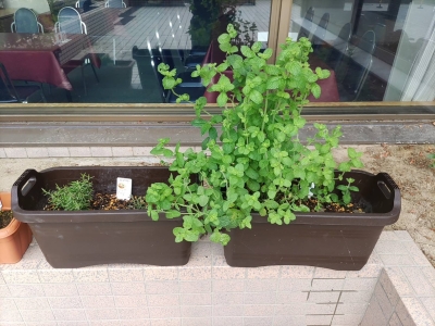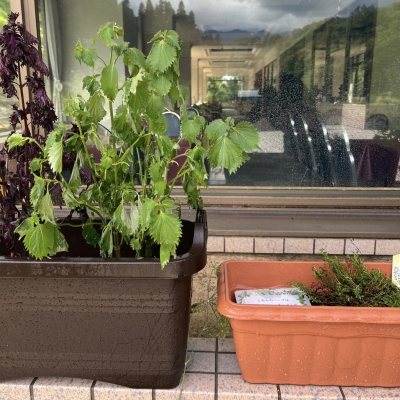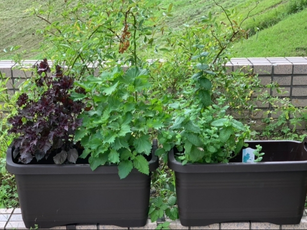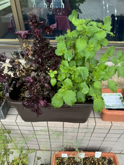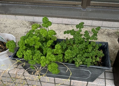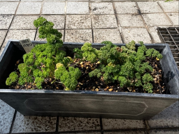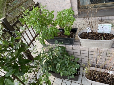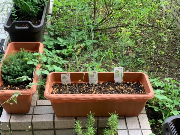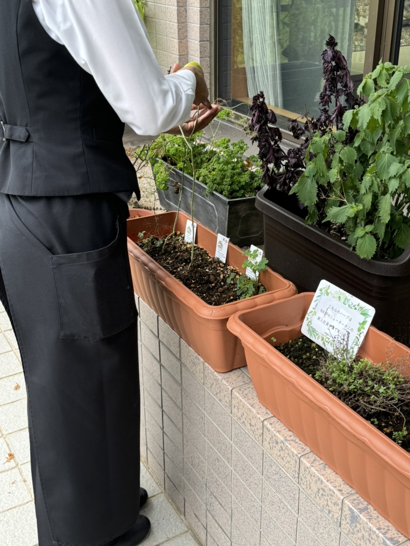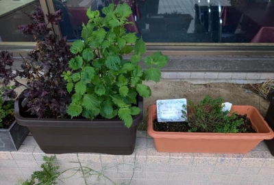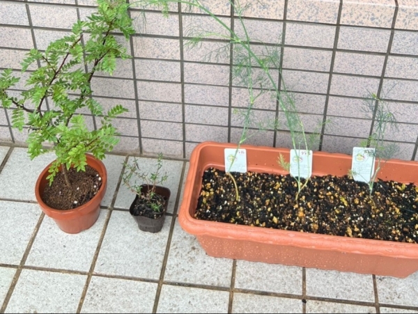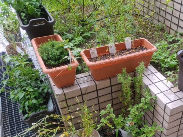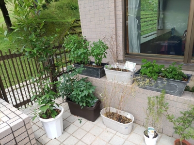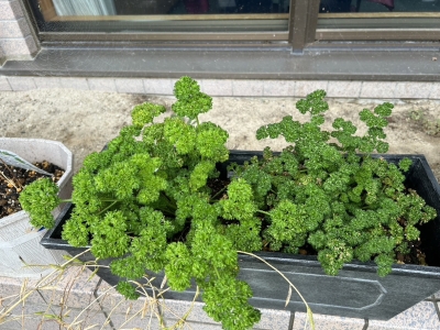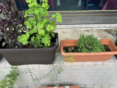 ハーブやローズマリーやパセリなどの数種類の食用植物を育てながら