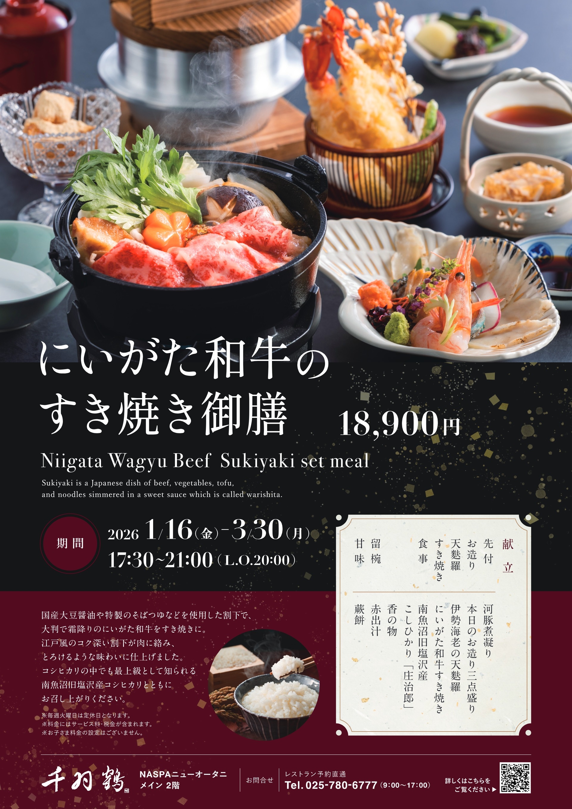 | 営業時間 | 17:30~21:00 ※にいがた和牛すき焼き御膳は20:00ラストオーダーとさせていただきます |