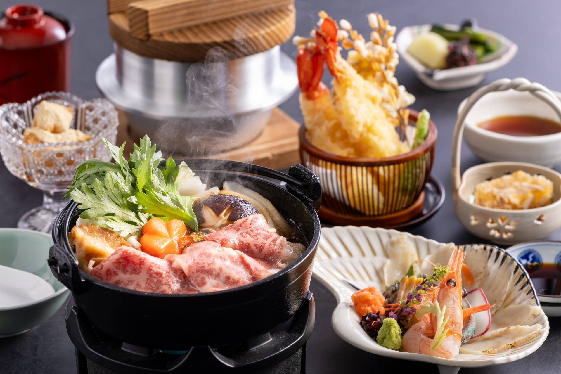 国産大豆醤油や特製のそばつゆなどを使用した割下で、大判で霜降りのにいがた和牛をすき焼きに。