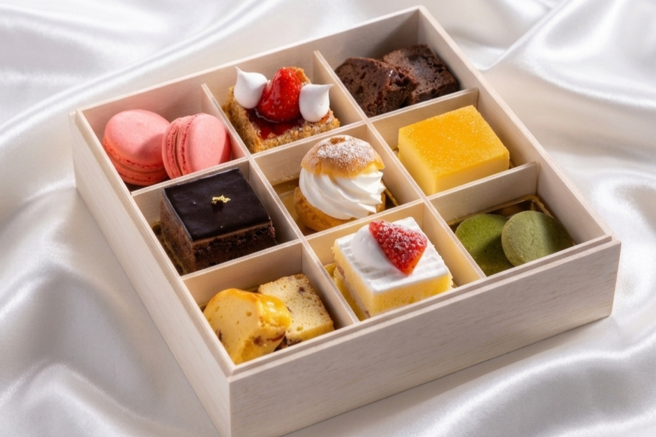 選りすぐりのスイーツ9種類を美しく並べた、まさに“食べられる宝石箱”。